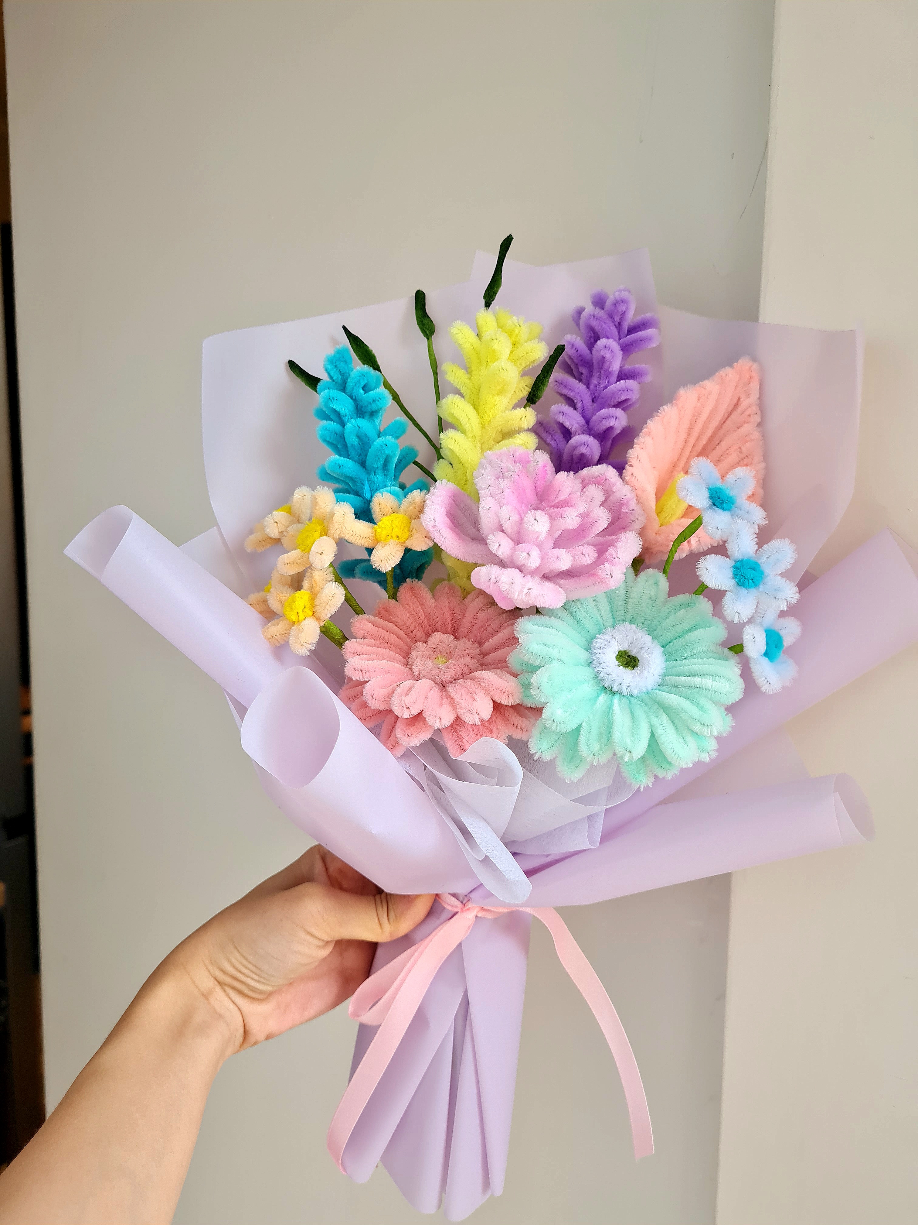 A cheerful handcrafted bouquet featuring a soft mix of pastel pink, mint, yellow, blue, and lavender blooms. Beautifully arranged and wrapped in delicate pastel paper, this bouquet brings a playful yet elegant charm. Long-lasting and maintenance-free, it’s perfect for birthdays, celebrations, or brightening someone’s day. 🌈🌸